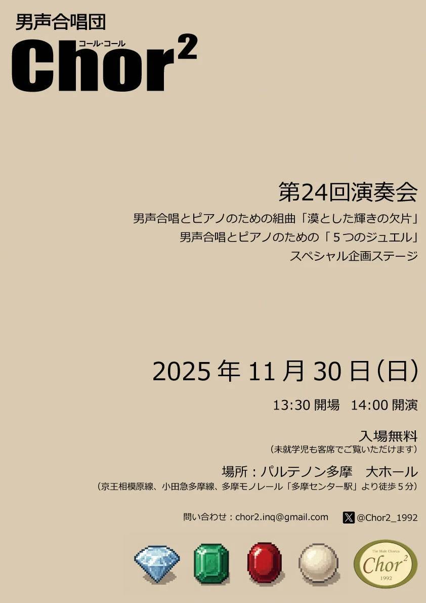 男声合唱団コール・コール 第24回演奏会 大ホール 開催日: 2025年11月30日 公演情報 2025年11月30日(日) 14:00開演(13:30開場)会場:大ホール入場無料・全席自由※未就学児でも客席でご覧いただけます プログラム 男声合唱とピアノのための組曲「漠とした輝きの欠片」男声合唱とピアノのための「5つのジュエル」スペシャル企画ステージ お問い合わせ コール・コールメールアドレス:Chor2.inq@gmail.comXアカウント:@Chor2_1992