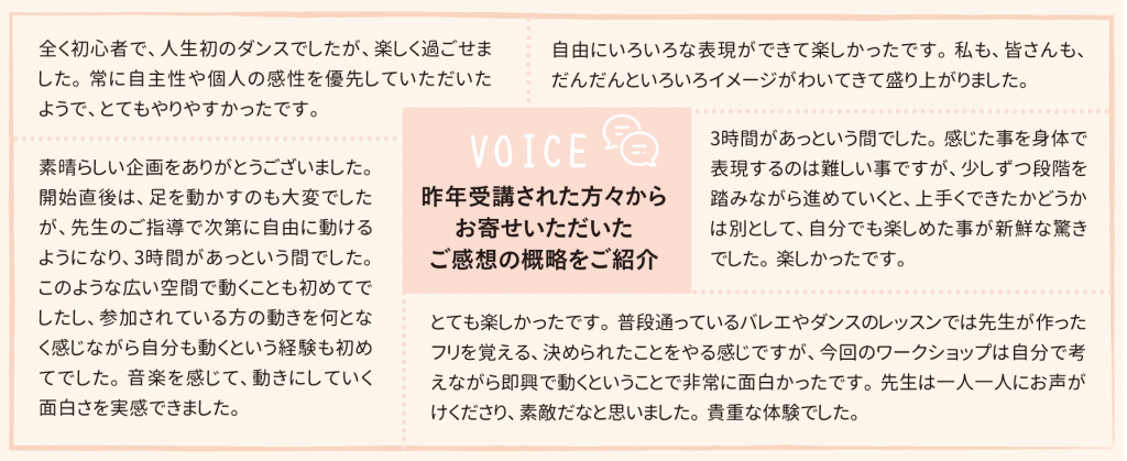 丁寧な指導で定評のある講師と共に日常の動作をダンスにしてみる体験、美しい動きを表現してみる体験、リハーサルを経て皆で踊る体験など、楽しくお気軽にご参加いただけます!
