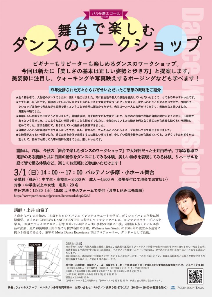 パル多摩エコール「舞台で楽しむダンスのワークショップ」〔2026.3/1(日)3時間限り〕受講申込受付中!早春に心と身体をリフレッシュの機会!