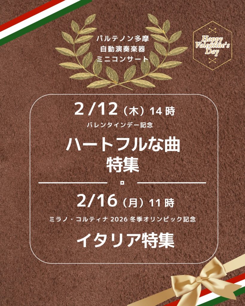 2月の自動演奏楽器ミニコンサートは、12日には近づくバレンタインデーを記念して「ハートフルな曲」を、さらに、16日には開催中のミラノ・コルティナ2026冬季オリンピックを記念して、「イタリア特集」をテーマにお届けしたいと思います。ぜひこの機会にお気軽にご参加ください!