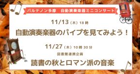 自動演奏楽器ミニコンサート①11/13「自動演奏楽器のパイプを見てみよう!」②11/27「読書の秋とロマン派の音楽」