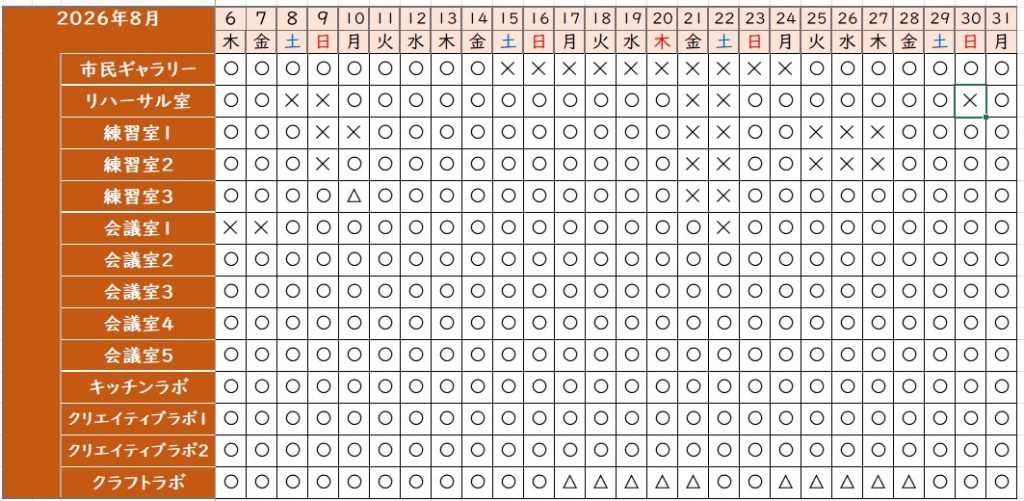 ・2026(R8)年8月利用分 諸室(市民ギャラリー、会議室、リハーサル室、練習室、キッチンラボ、クリエイティブラボ、クラフトラボ)