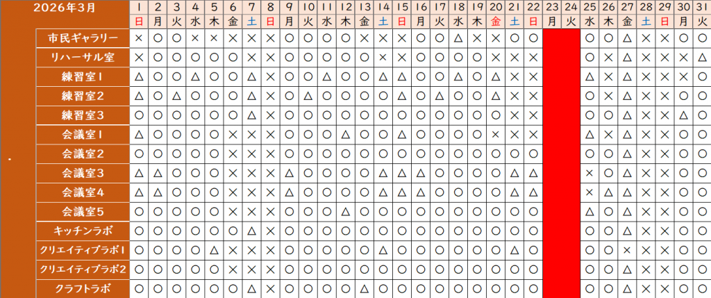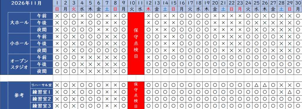 対象は2026年11月の大ホール・小ホール・オープンスタジオ、2026年3月の諸室です。今後の催事や活動の参考にしていただくと幸いです。