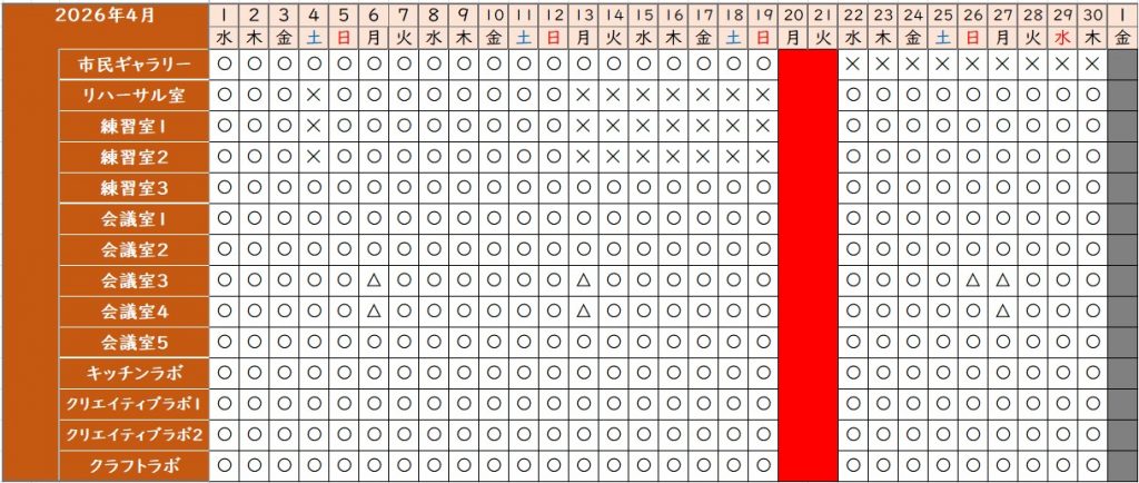 ・2026(R8)年4月利用分  諸室(市民ギャラリー、会議室、リハーサル室、練習室、キッチンラボ、クリエイティブラボ、クラフトラボ)