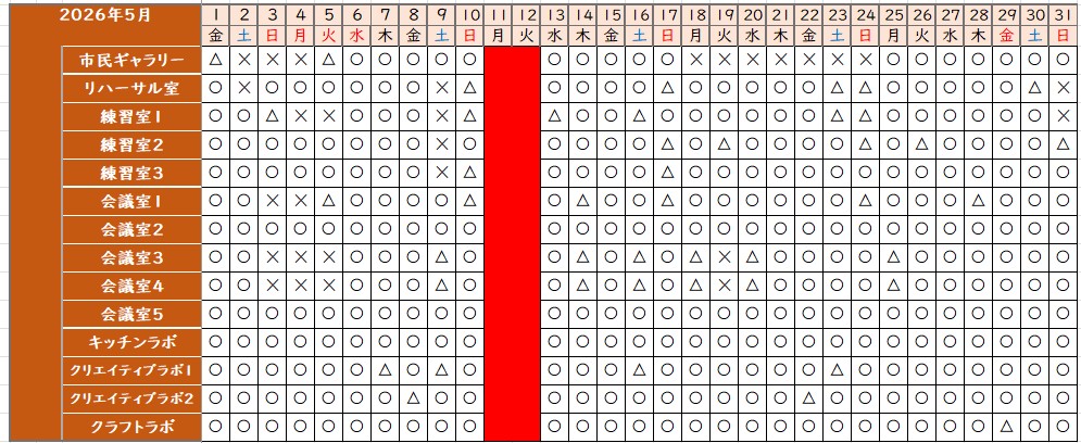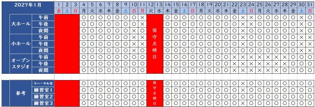 対象は2027年1月の大ホール・小ホール・オープンスタジオ、2026年5月の諸室です。今後の催事や活動の参考にしていただくと幸いです。