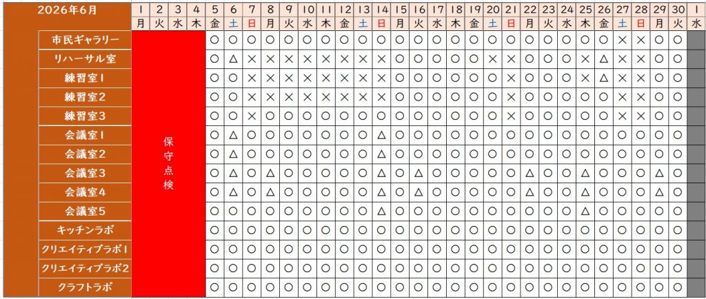 ・2026(R8)年6月利用分 諸室(市民ギャラリー、会議室、リハーサル室、練習室、キッチンラボ、クリエイティブラボ、クラフトラボ)